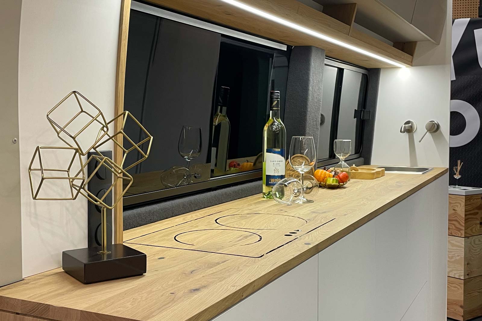 Ein neues Raumkonzept brachte der Erstaussteller Joy Rider mit: Sein Fiat-Ducato-Ausbau hat das Wohn-Schlafzimmer vorne, Küchenzeile, Schränke und Nasszelle befinden sich im hinteren Teil des Fahrzeugs. Der Joy Rider ist „handcrafted in Austria“ und hebt sich mit seiner Verglasung und Glossy-Lackierung von gängigen Vans ab. Das Raumkonzept hat allerdings so seine Tücken: Für groß gewachsene Menschen erweist sich das Sideboard oberhalb der Couch beim Sitzen als Hindernis – und die Oberschränke der Küche konnten wir nicht öffnen, dazu müssten wir wesentlich kleiner sein, damit die Schränke über Kopf aufgehen. Da jedes Stück ein handgefertigtes Unikat mit einem Preis ab 117.900 Euro ist, kann man davon ausgehen, dass diese Details für jeden Kunden individuell angepasst werden können.