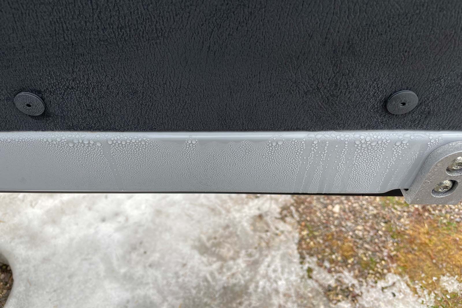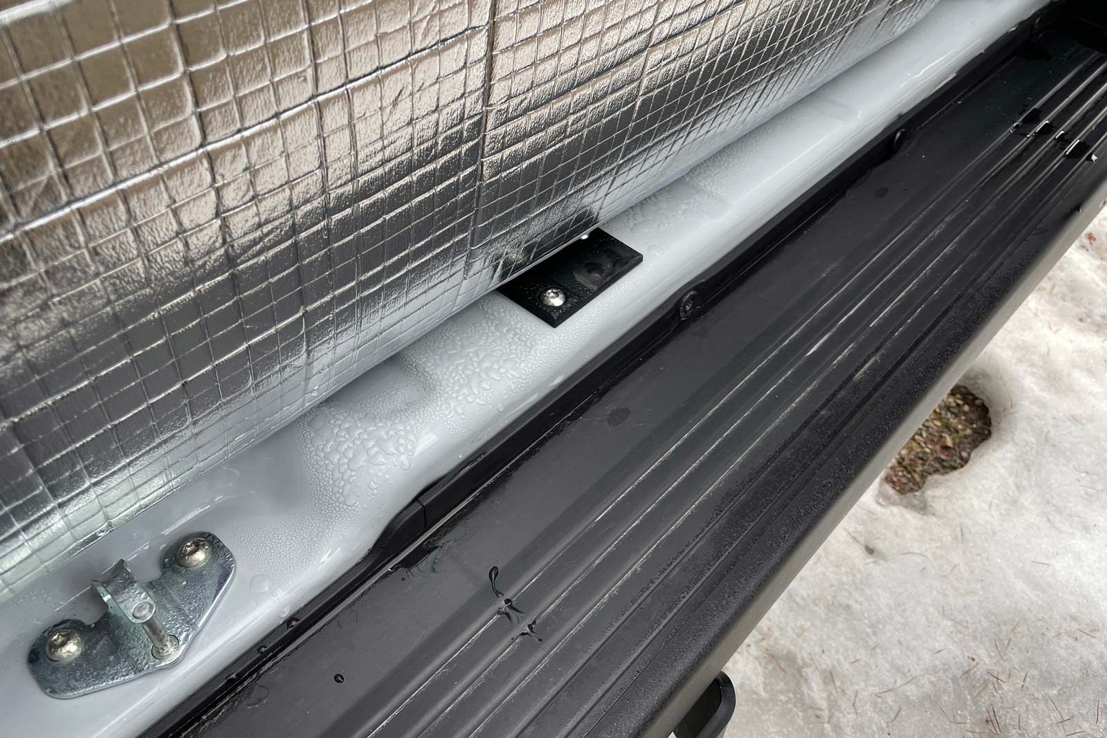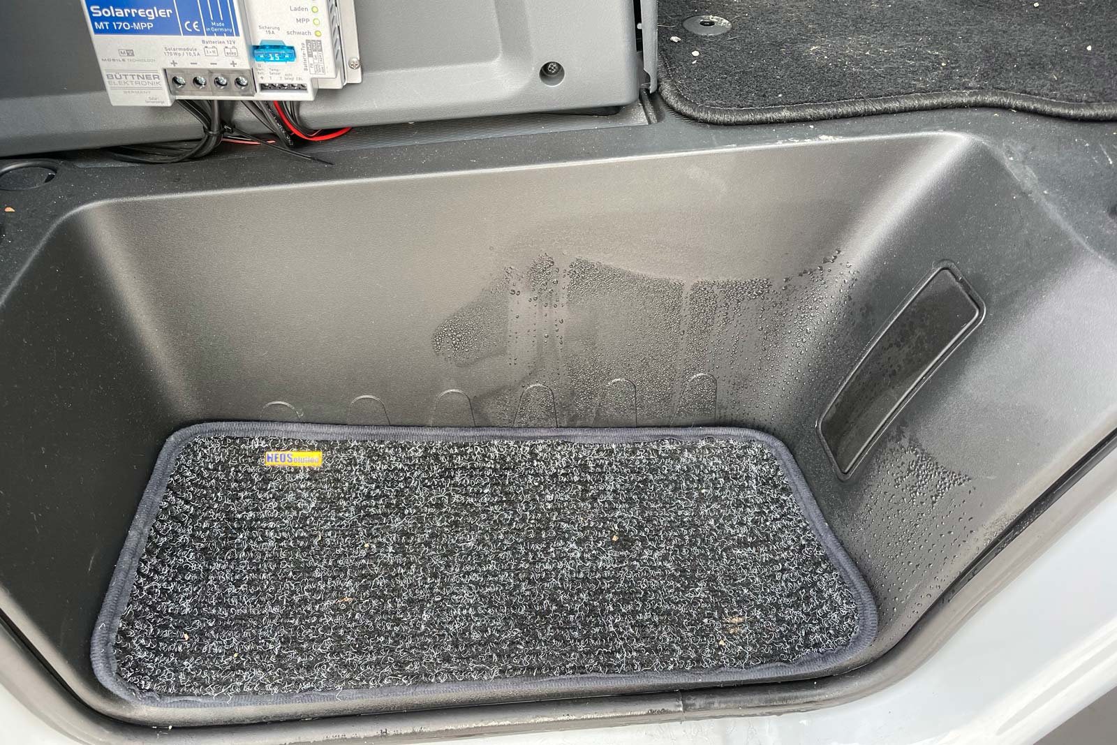 Wir überprüften den Van regelmäßig auf feuchte Stellen, Kondenswasser usw. Im Innenraum blieb alles trocken. Allerdings sammelte sich Kondenswasser zwischen Heck-Isolierung und Hecktüre, das man immer wieder trockenwischen sollte. Durchlüften über die Hecktüre hilft zusätzlich. Auch zwischen der Fußraumisolierung und den Türen der Fahrgastkabine sammelte sich Wasser an. Diese Kältebrücken sollte man unbedingt im Auge behalten und regelmäßig trocknen!