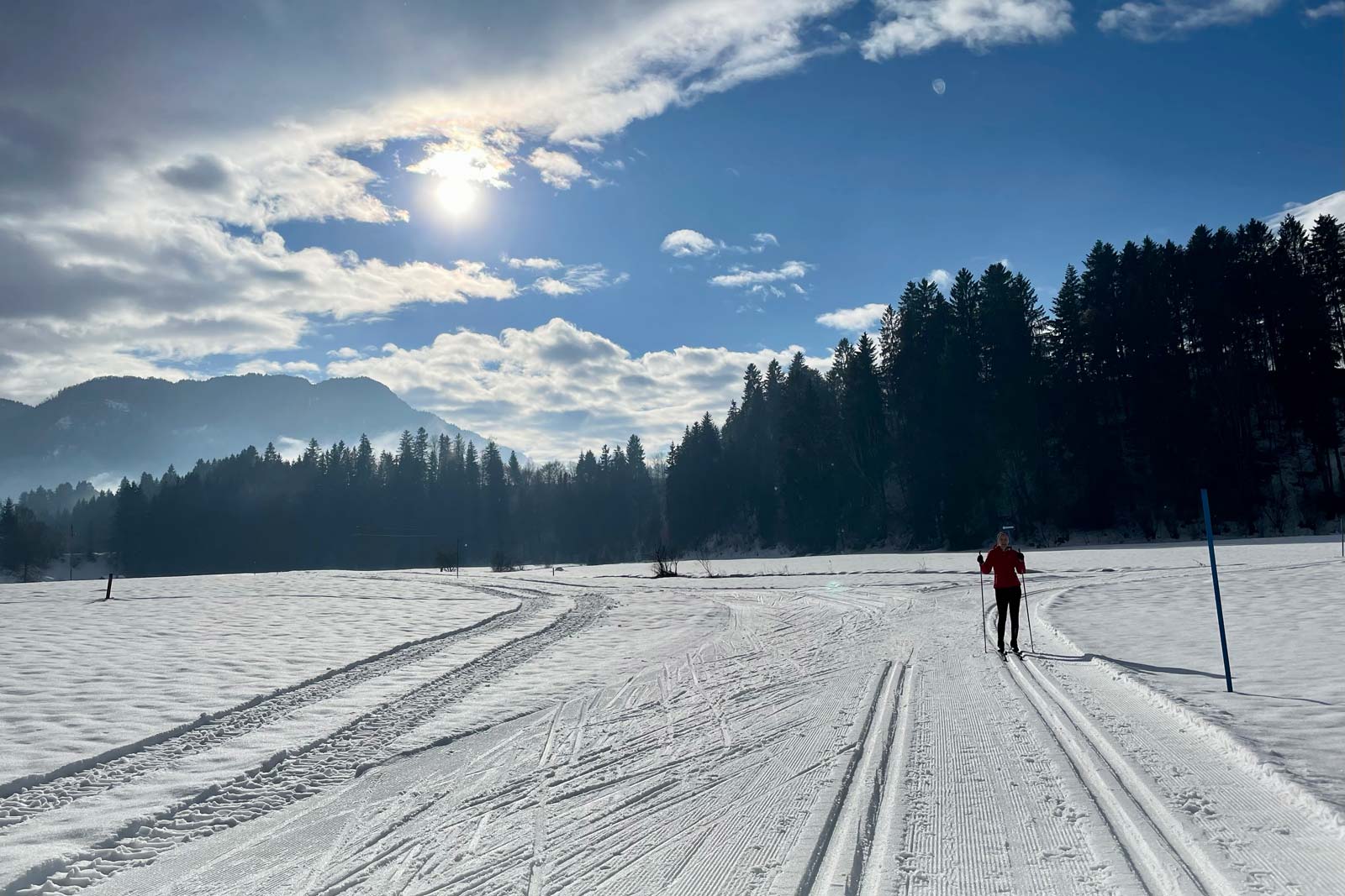 Die Talstation der Unterbergbahn zum Skigebiet Hochkössen befindet sich 350 Meter vom Campingplatz entfernt und kann entweder zu Fuß erreicht werden oder man steigt am nahegelegenen Parkplatz des Skigebiets in den Zubringerbus, der einen einmal um die Ecke chauffiert. Auch zwei Langlaufloipen grenzen direkt an das Camp-Gelände und sind mühelos zu Fuß erreichbar. Die Loipenbenutzung ist für Touristen gebührenfrei, denn beim Check-in erhält man die Kaiserwinkl Card, die viele Leistungen umfasst. Für die Skiausrüstung gibt es wie gesagt einen Trockenraum, was natürlich sehr praktisch ist. Der Ort Kössen selbst ist rund 20 bis 30 Gehminuten entfernt (je nachdem, wo man hinwill), ein Spaziergang lohnt sich auf jeden Fall. Supermärkte und Geschäfte haben hier im Tourismusgebiet auch sonn- und feiertags geöffnet.